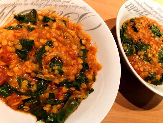 6. Once the lentils are soft, add the chopped spinach and cook for about 2 minutes or until mixed in and cooked.